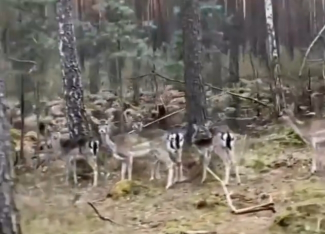 На відео можна побачити близько десятка оленів, що пасуться поряд із ґрунтовно дорогою.