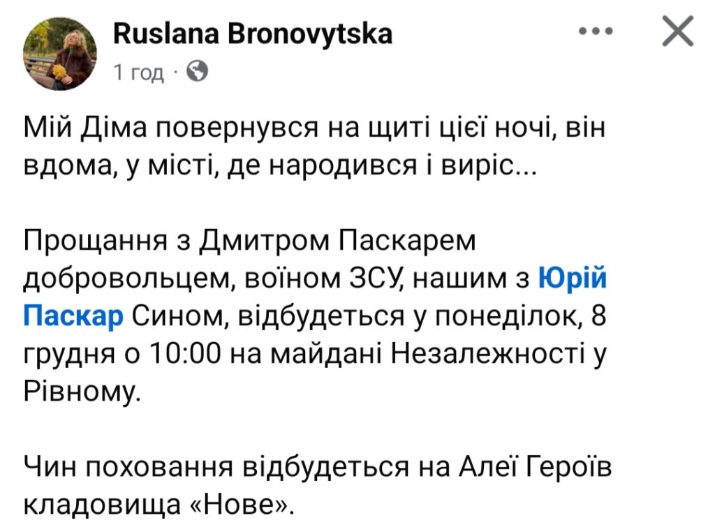 На жаль, загибель військовослужбовця підтвердилася минулого місяця. А у понеділок з Дмитром Паскарем прощатимуться рівняни на майдані Незалежності. Про це повідомила його матір, письменниця та режисерка Руслана Броновицька.