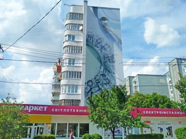 – Ми вирішили торкнутися теми свободи. Як символ вільної думки і вибору дій обрали образ птаха, що розчиняється у геометричних силуетах міста, що, в свою чергу, покликані розчинити прямі лінії міського образу і надати їм динаміки і різноплановості. Також використали шрифтовий патерніз сучасної каліграфії в поєднанні з традиційним орнаментом. Цей малюнок про міське середовище та істот, що його населяють. Про взаємопов`язаність людей, тварин та предметів. Про компроміс, що повинен бути присутній у подібних просторах. Інакше конфлікти будуть знищувати усіх і усе. Гармонія та свобода – основні означення цього стінопису», – так характеризують свій мурал автори-переможці.