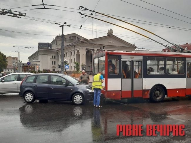 Як повідомляють очевидці для “РВ”, легковик повертаючи з сусідньої вулиці на Соборну, в’їхав у тролейбус, який пригальмував.