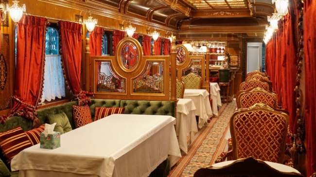 Вагон оздоблений позолотою, оксамитовими диванами і стільцями, а також розкішним деревом.