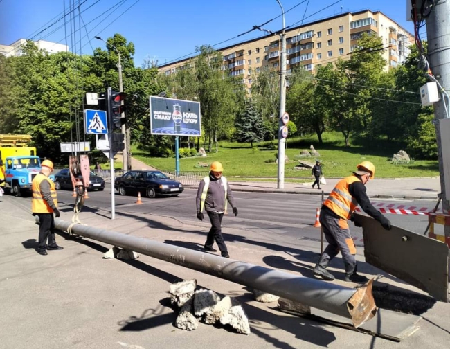 Замість старої опори, котра з часом відхилилася від вертикалі та могла впасти, встановили нову, забетонували фундамент, а після досягнення бетоном міцності – перенесли на неї навантаження.