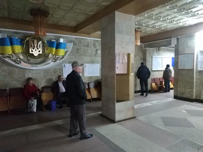 Виборці очікують у холі університету. До зали, де проходитиме голосування, нікого до офіційного відкриття дільниці не впускають.