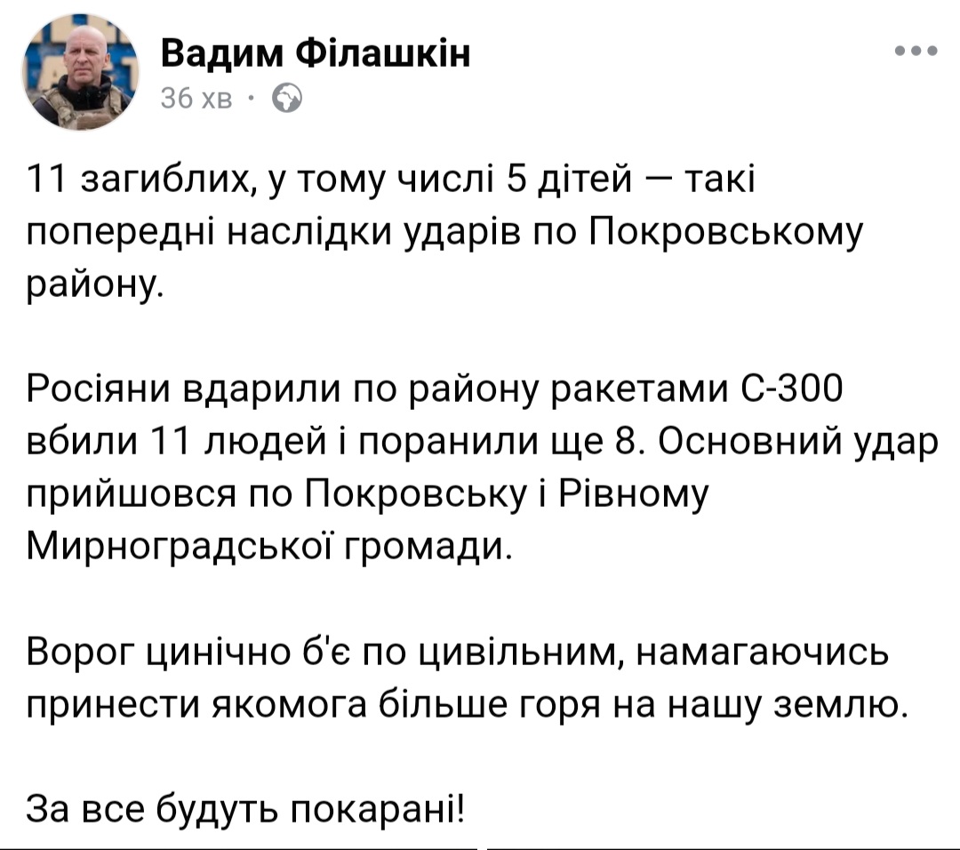 – У Покровську в моменту удару в будинку перебували 5 осіб, зокрема двоє дітей – хлопчики віком 15 та 17 років.