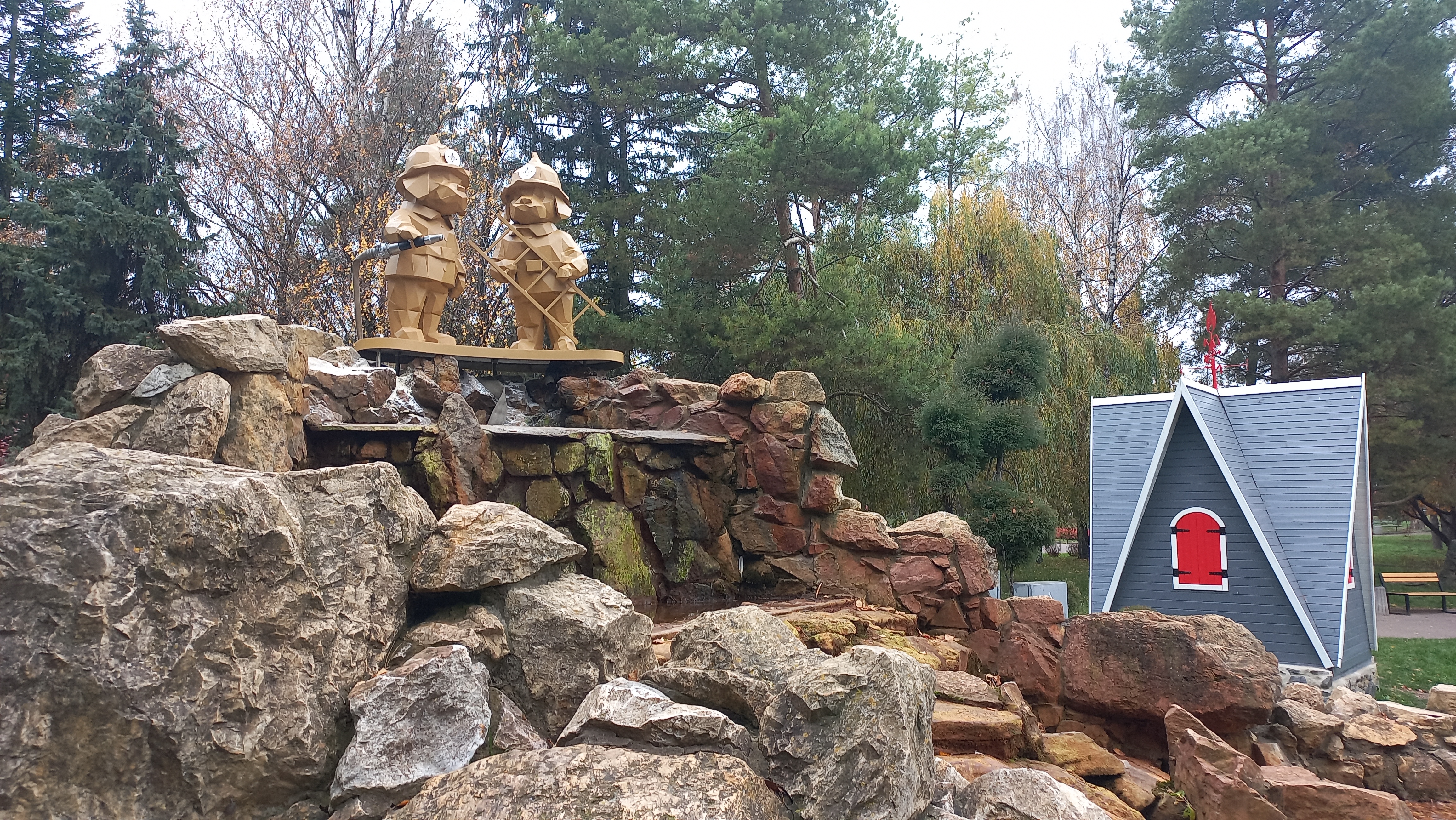 Фігурки двох собак-рятувальників у касках тепер прикрашають невеликий штусний водоспад на ставку Лебединки.