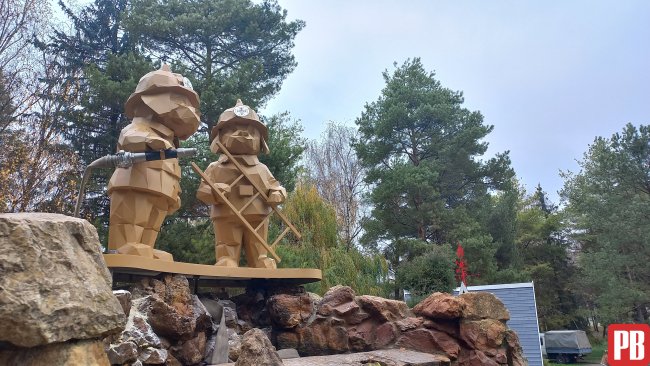 Фігурки двох собак-рятувальників у касках тепер прикрашають невеликий штусний водоспад на ставку Лебединки.