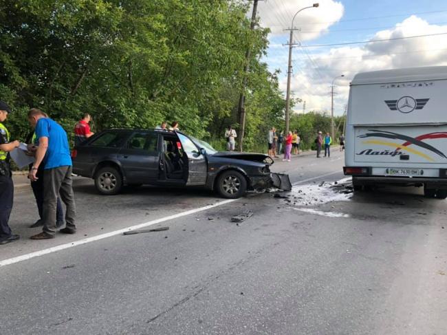 Поліцейські попередньо встановили, що близько 17:15 на вулиці Чорновола обласного центру водій автомобіля «Audi» з невідомих поки причини виїхав на смугу зустрічного руху, де допустив зіткнення із маршрутним таксі сполученням «Рівне-Острог».