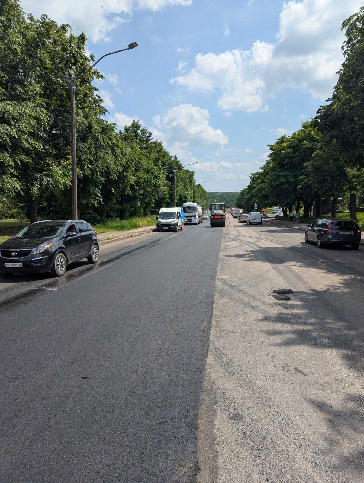 На місці працює спеціалізована техніка, яка рівномірно розподіляє свіжий асфальт по дорожньому полотну. Вантажівка підвозить гарячу асфальтобетонну суміш.