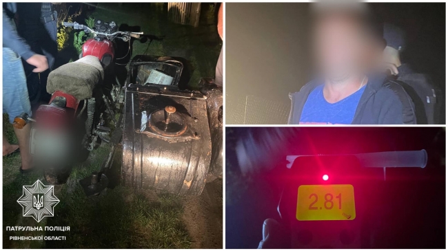 – Учора вночі, близько 2-ї години, в населеному пункті Олександрія патрульні зупинили водія мотоцикла Днепр-КМЗ, який порушував комендантську годину. У 37-річного керманича інспектори виявили ознаки алкогольного сп’яніння. Чоловік пройшов огляд на місці зупинки за допомогою алкотестеру Драгер, який показав позитивний результат — 2,81 проміле. З результатом водій погодився.