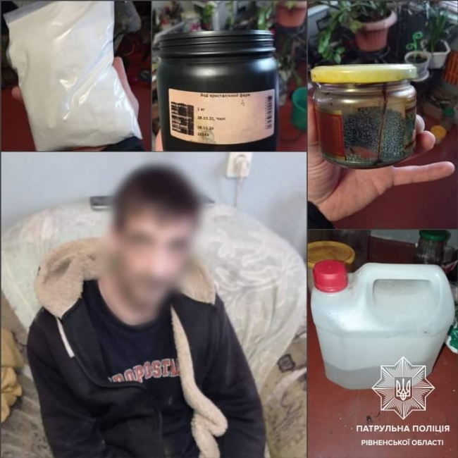 Чоловік пояснив, що там його власна лабораторія, де він виготовляє наркотичні речовини. Ще він показав патрульним zip-пакет, у якому, з його слів, був первітин власного виробництва. Окрім цього, 43-річний рівнянин продемонстрував поліцейським прекурсори. Як він зазначив, це були червоний фосфор, йод кристалічний, розчин соляної кислоти, ізопропіловий спирт, місткість для мелення пігулок і самі таблетки. А на столі лежала лампа та фольга із нашаруванням білої речовини.