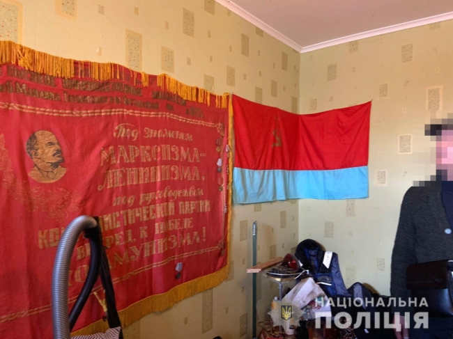 У його квартирі вони виявили револьвер під патрон типу «Флобер», ніж, сім скляних колб з нашаруваннями речовини коричневого кольору, бронежилет, танковий приціл, чотири прапори, значки, медалі з елементами комуністичної символіки та кітель радянського зразка.