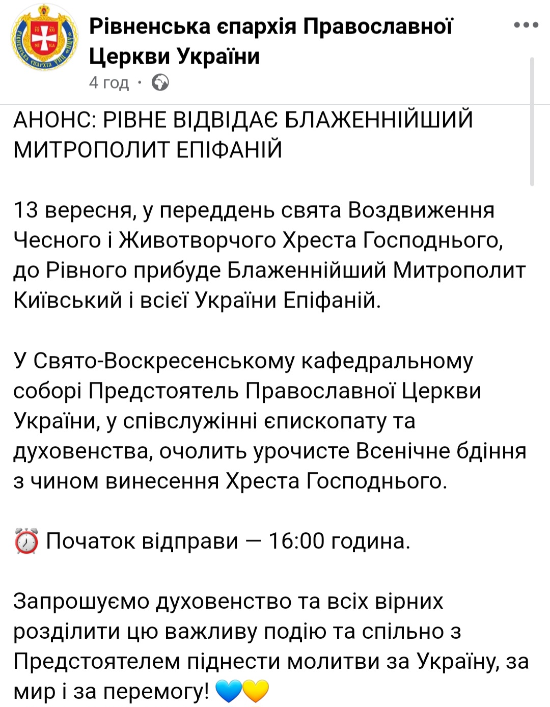 Як повідомляють у Рівненській єпархії ПЦУ, 13 вересня – переддень свята Воздвиження Чесного і Животворчого Хреста Господнього, до Рівного прибуде Блаженнійший Митрополит Київський і всієї України Епіфаній.