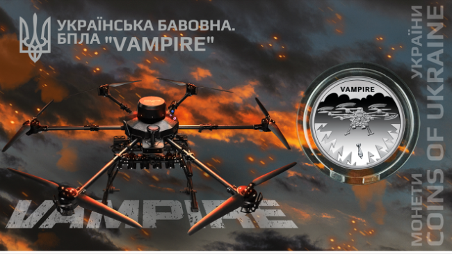 Памʼятна монета номіналом 5 гривень увійшла до серії «Збройні Сили України» під назвою «Українська бавовна. БПЛА Vampire». На аверсі зображено понівечену вибухами землю, оборонні шанці, підбитий та охоплений вогнем ворожий танк, а над полем — силует дрона Vampire у польоті. На реверсі — гексакоптер Vampire скидає боєприпас. На тлі хмара з блискавками, які символізують швидкість, точність та міць дрона.