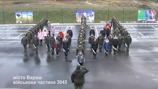 Низький уклін та вияв своєї непохитної патріотичної позиції продемонстрували військові в/ч 3045 з охорони та оборони Рівненської АЕС. Понад 150 активістів вишикувавшись в «живу» фігуру тризуба, вигукували гасла: Слава Україні! Героям Слава!, Відважним українським морякам! Слава! Слава! Слава! “