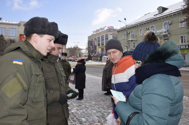 На кінець флешмобу нацгвардійці також вишикувалися у шеренгу під пам’ятником Шевченку на майдані та хором виконали гімн України.