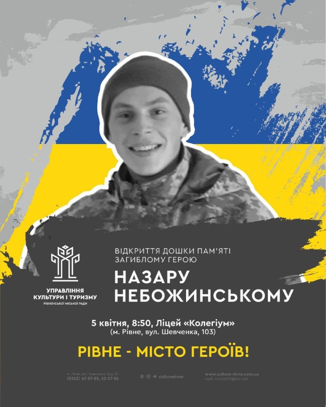 – Завтра, 5 квітня, о 08:50 на фасаді ліцею “Колегіум” відбудеться відкриття дошки пам’яті загиблому Герою Назару Небожинському, – повідомив в.о. міського голови Рівного Віктор Шакирзян.