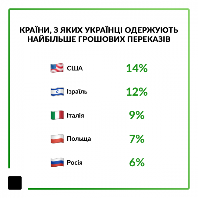 За даними статистики «ПриватБанку», до п’ятірки країн, звідки надійшло найбільше грошових переказів в Україну, увійшли США, Ізраїль, Італія, Польща та Росія.