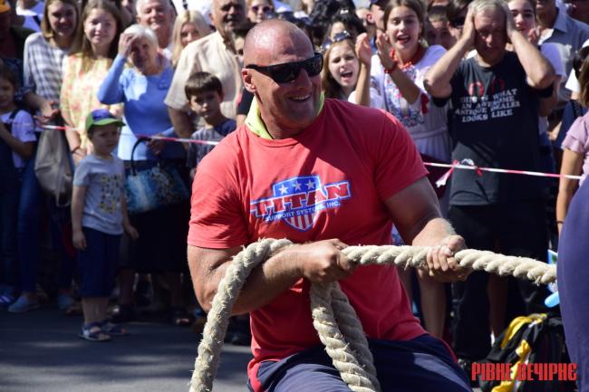 Стронгмени перекидали колеса, підіймали важкі предмети та перетягували канат.