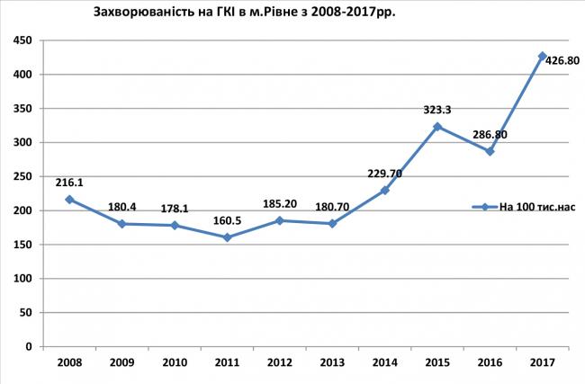 Захворюваність гострими кишковими інфекціями у порівнянні з 2016 роком зросла торік у Рівному на 48,8%, що є найвищою за останні 15 років та вищою від середньообласного показника в 2,6 раза. Було зареєстровано 1053 випадки. Зростання серед гастроентеритів відбувся переважно внаслідок ротавірусної інфекції (94,1%). Серед усіх захворілих – 66,9% діти до 17 років (704 випадки). Найбільш високою є захворюваність серед дітей віком від 1 до 4 років – 42,2% (444 випадки).