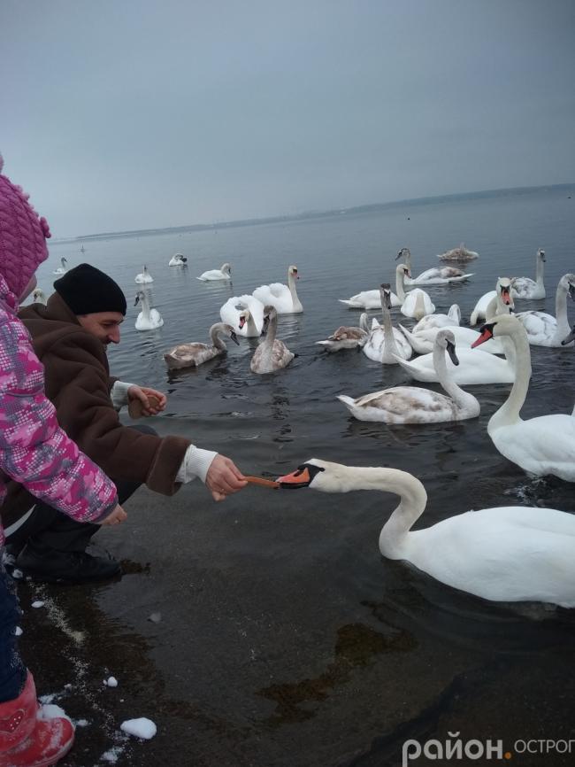 Острожани та гості залюбки підгодовують лебедів, які, звиклі до людської присутності та уваги, підпливають досить близько й навіть беруть частування з рук, повідомляє Оstrog.rayon .