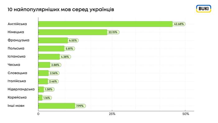 Передбачувано, найбільше українці вивчають англійську мову. Вона корисна для навчання, роботи, подорожей, причому не лише в англомовних країнах, а практично у всьому світі. Це мова міжнародного та ділового спілкування, бізнесу і виходу на іноземні ринки, можливостей для стажувань та кар’єри.