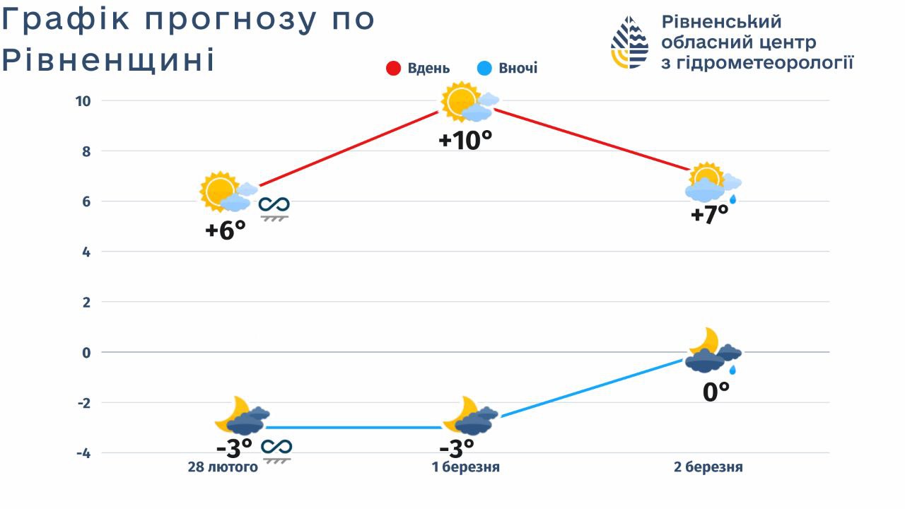 28 лютого, субота: без опадів. Вночі та вранці слабкий туман. На окремих ділянках доріг ожеледиця. Вітер південно-західний, 7-12 м/с.