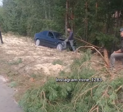 Автомобіль “БМВ” злетів з дороги у кювет та там врізався у дерево, розтрощивши собі капот. Дерево також зламалось. Вибратись з кювету водію допомагав тракторист.