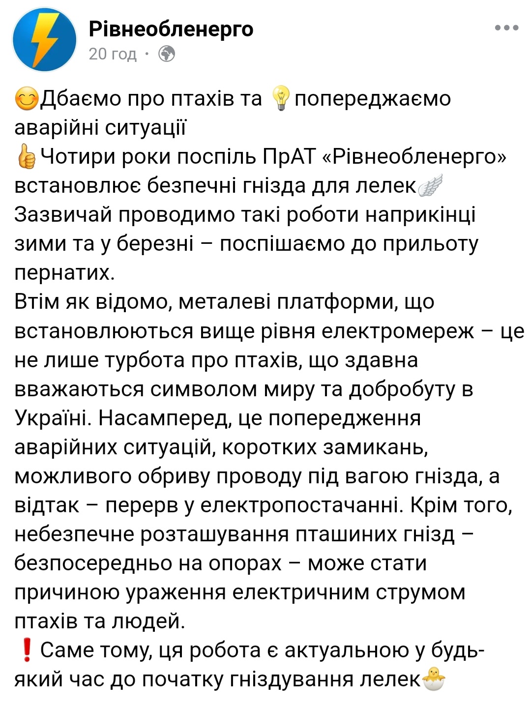 Загалом за чотири роки рівненські енергетики змонтували понад 300 платформ для лелек.