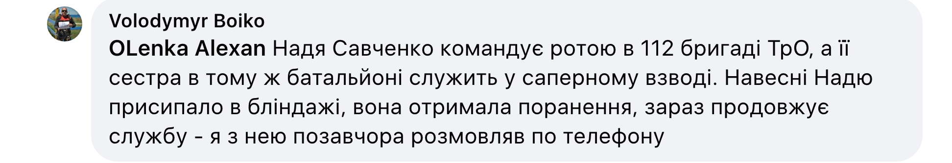 І от стало відомо, що Надія і Віра Савченко досі на фронті – у складі 112-ї окремої бригади Сил територіальної оборони ЗСУ. Про це написав у коментарі до свого посту публіцист Володимир Бойко.