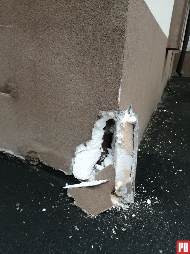 Цього тижня на будівлі сесійної зали міськради по вул. Поштовій,2, утворилася діра - аж видно товщину матеріалу, яким утеплювали стіну.