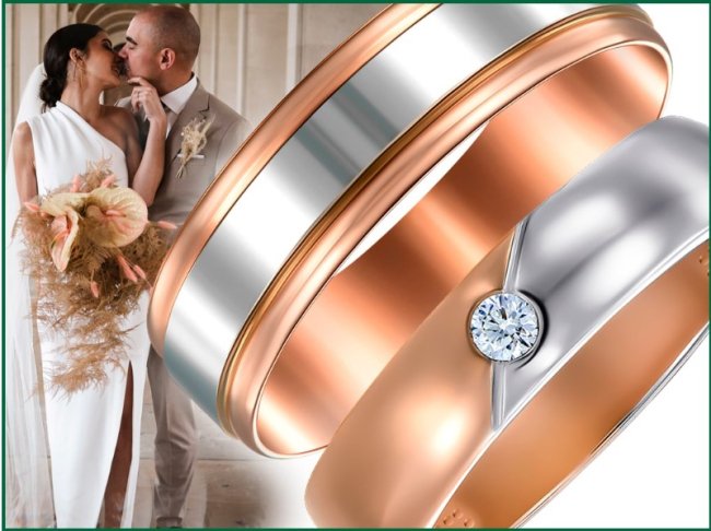 Це напевно перше питання, на яке мають відповісти молодята – який метал має бути у обручки. Ювеліри пропонують кілька варіацій – класичне золото, срібло або навіть преміальні варіації з платини. Також доступні обручки, при виготовленні яких поєднана платина і золото або кілька сплавів голда. Срібні обручки теж вражають різноманіттям і відрізняються за кольором в залежності від того майстер ювелір використав позолоту в якості покриття, родій чи чорніння.