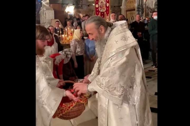 Під час великоднього богослужіння митрополит УПЦ (МП) Онуфрій розкидав парафіянам освячені яйця.