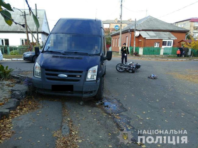 Водій мотоцикла «Kinlon», 30-річний житель села Чемерне, на перехресті рівнозначних доріг райцентру, не надав переваги в русі автомобілю «Ford Transit» під керуванням 38-річної сарненчанки. Мотоцикліста доставили до медзакладу зі струсом головного мозку, забоями та переломом ноги. Обоє водіїв були тверезі. Транспортні поміщені на територію Сарненського відділу поліції.