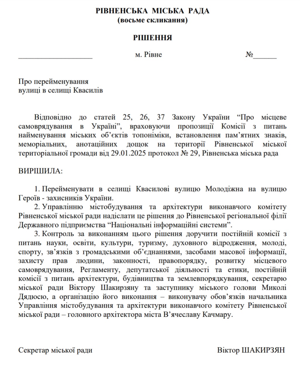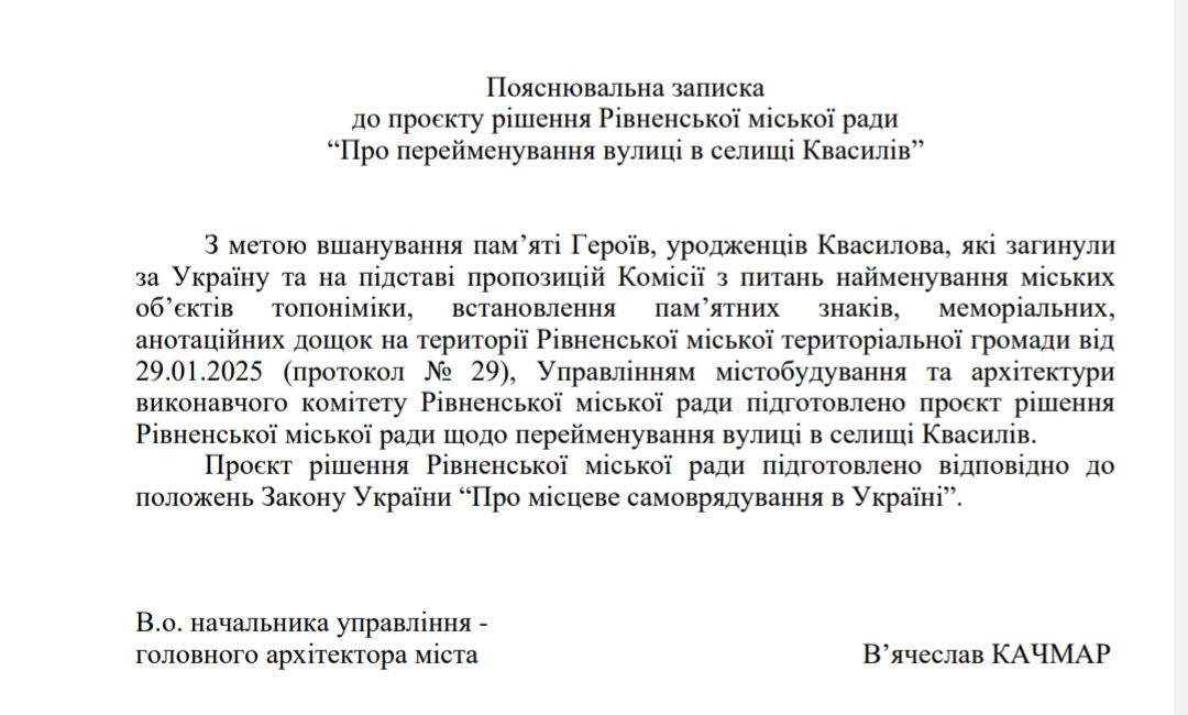 На сайті міської ради Рівного з’явився проєкт рішення про перейменування вулиці Молодіжної у Квасилові. Щоби вшанувати військовослужбовців родом з цього селища, які загинули на війні, вулиці дадуть нову назву – Героїв – захисників України.