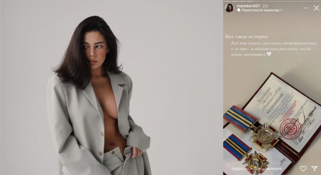 Після зустрічі в ОП вона похвалилася, що отримала від Головного управління розвідки Міноборони відзнаку «за сприяння воєнній розвідці України ІІ ступеня». Втім, згідно з документом, нагороду їй присвоїли ще 13 жовтня 2022 року.