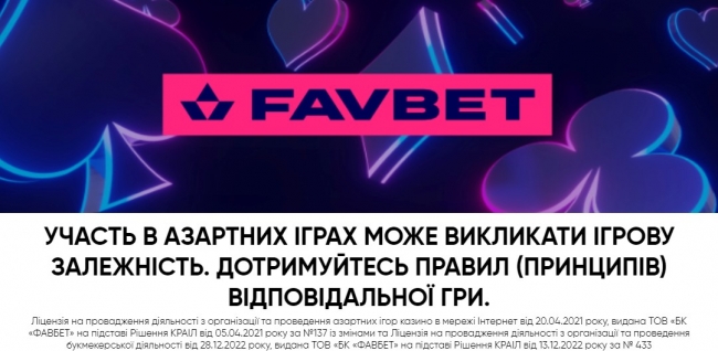 Ліцензія на провадження діяльності з організації та проведення азартних ігор казино в мережі Інтернет від 20.04.2021 року, видана ТОВ «БК «ФАВБЕТ» на підставі Рішення КРАІЛ від 05.04.2021 року за №137 із змінами та Ліцензія на провадження діяльності з організації та проведення букмекерської діяльності від 28.12.2022 року, видана ТОВ «БК «ФАВБЕТ» на підставі Рішення КРАІЛ від 13.12.2022 року за № 433.