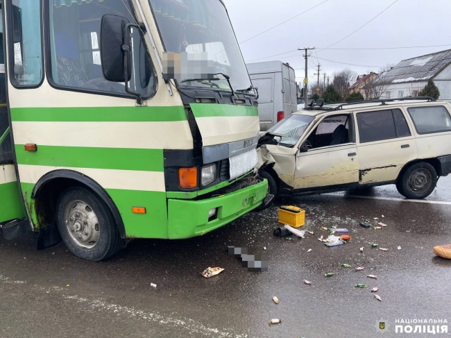 Водій та 30-річний пасажир легковика отримали забої. Крім того, в салоні маршрутки перебувало 15 пасажирів — ніхто з них не постраждав.