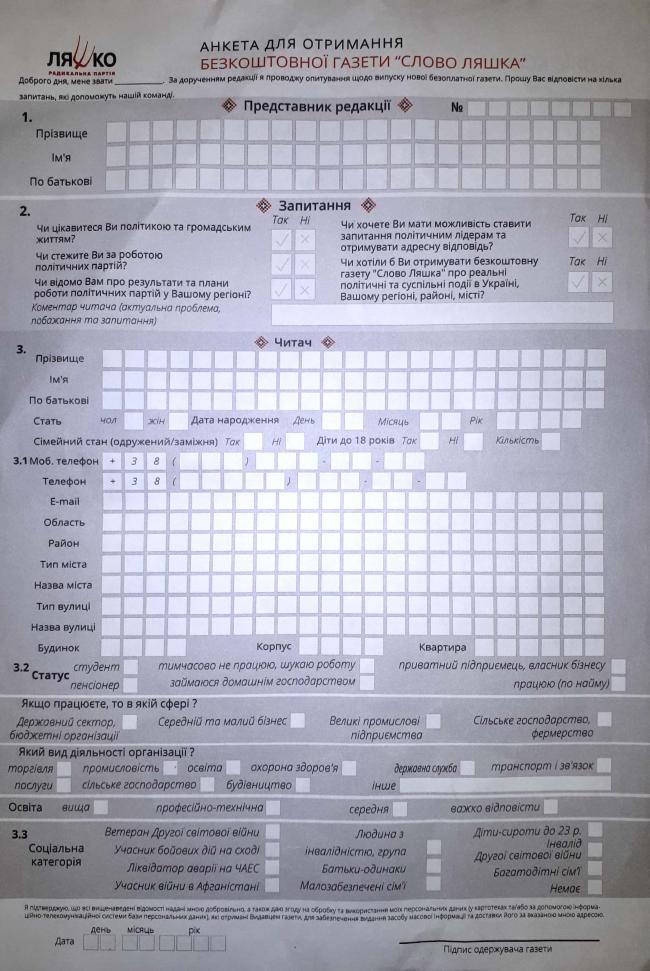 Другий випадок був зафіксований у Костополі. Так, в осередку Радикальної партії Олега Ляшка спостерігачі ОПОРИ виявили анкету для отримання безкоштовної газети «Слово Ляшка», заповнюючи яку читачу потрібно зазначити свої персональні дані (прізвище, ім’я та по батькові, стать, дату народження, сімейний стан та кількість дітей, мобільний телефон та e-mail, місце проживання, освіту, статус та сферу діяльності, соціальну категорію.