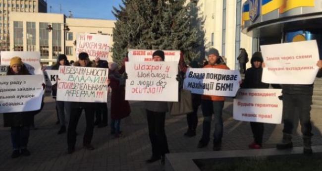 Рівняни тримають у руках плакати «Влада покриває махінації БКМ», «Земля через схеми – ошукані власники», «Ні! Шахраям забудовникам» і т.п.