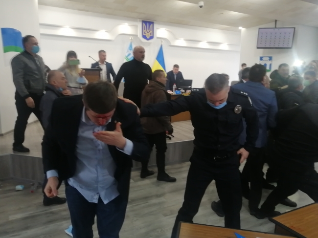 Міський голова спробував заспокоїти присутніх, щоб не було “як у парламенті”. На підлозі валяються зірвані маски та залишилися краплі крові.