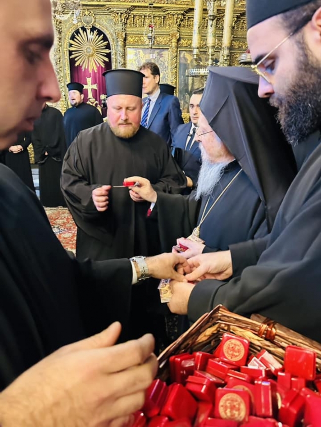 – На прохання військових з передової були вручені шеврони Патріарху як згадка про незламність України та переконливу віру в нашу Перемогу, – повідомив у Фейсбуці протоієрей Василь Рудніцький. – Під час війни, ми всі намагаємося вкласти свою лепту для допомоги нашим військовим. Українська майстриня Катерина Турчина розписує гільзи від снарядів для продажу на аукціоні і виручені кошти передає на ЗСУ. Саме такі гільзи були вручені при зустрічі із Вселенським Патріархом, акцентуючи увагу на те, що наш народ будь яке зло перетворює на Добро. З непохитною вірою в допомогу Божу ми молилися в Патріаршому храмі св. Георгія, святого Стефана, Влахернській церкві та в монастирі «Живоносне Джерело» за перемогу України над російським агресором.