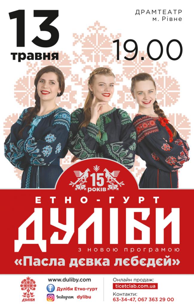 «Поринути в атмосферу автентичної поліської пісні у виконанні прекрасних українок зможуть рівняни та гості міста. Живий звук, симфонічний оркестр, гра світла, режисерські задуми, нові пісні — все це буде на ювілейному концерті етно-гурту “Дуліби”. Колорит гурту та його самобутність залишаться у ваших серцях надовго», – повідомляють організатори концерту.