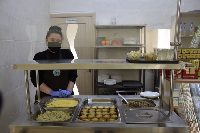 Заходимо в їдальню закладу. 18 січня в меню — овочевий картопляний суп-пюре, гречка або кукурудзяна каша з котлетою по-міланськи (котлета на парі з потертим сиром зверху), на вибір салат зі свіжої капусти або печена капуста. Страви мають апетитний вигляд, теплі і дуже смачні. Вартість комплексного обіду — 30 гривень. Пити дають або узвар, або апельсиново-лимонний напій. Зранку був бігос з гречкою за рецептом Клопотенка. Щодня — свіжі фрукти.