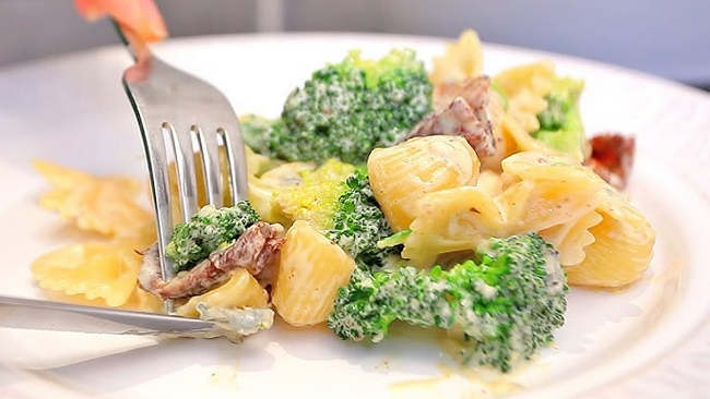 Інгредієнти: бекон — 250 г, цибуля-шалот — 1 шт., часник — 1 зубчик, броколі — 500 г, сіль та чорний перець — за смаком, яблучний оцет — 1 ст. л., паста невеликої форми (найкраще Orecchiette) — 250 г, вершкове масло — 1 ст. л., пармезан.