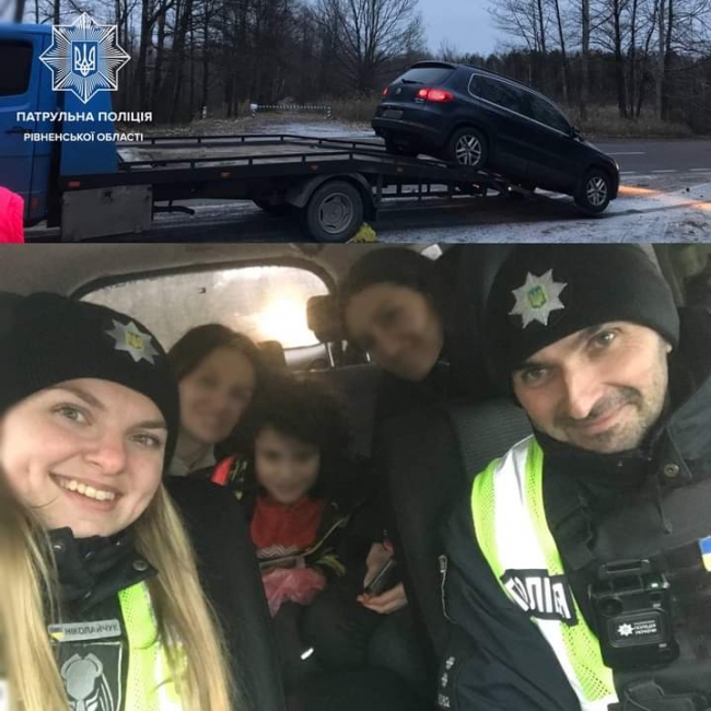Патрульні викликали евакуатор, а подорожнім запропонували завітати на сарненський пост патрульної поліції. Після того, як мандрівники відігрілись і зарядили гаджети, інспектори підвезли їх до найближчого автосервісу. А дорогою хлопчик розважав поліцейських своїми колядками.
