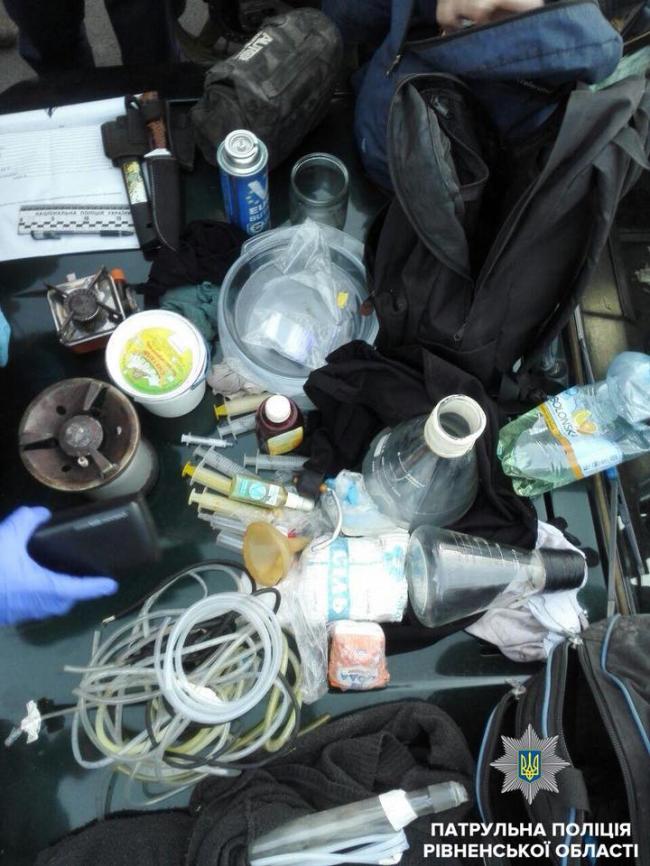 На місце події було викликано працівників управління протидії наркозлочинності. Під час огляду автомобіля поліцейські виявили переносну лабораторію, марихуану, близько 100 грамів сировини для виготовлення наркотиків та соляну кислоту об`ємом близько однієї літри.