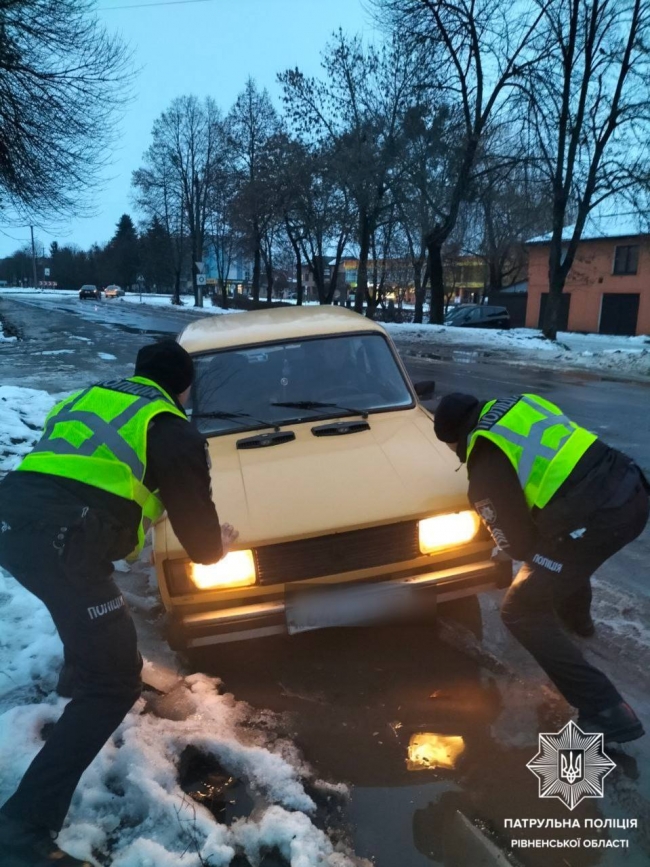 А ось учора під час патрулювання у Млинові дубенські патрульні помітили водія ВАЗа, що не міг зрушити з місця через ожеледицю. Поліцейські допомогли виштовхати автомобіль.