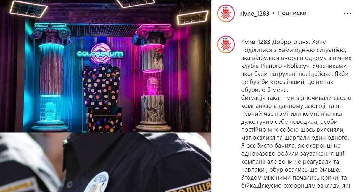 «Хочу поділитися з Вами однією ситуацією, яка відбулася вчора в одному з нічних клубів Рівного «Kolizey», учасниками якої були патрульні поліцейські. Якби це був би хтось інший, це не так обурило б мене, – пише дівчина. – Ситуація така: ми відпочивали своєю компанією в даному закладі, та в певний час помітили компанію, яка дуже гучно себе поводила, особи постійно між собою щось виясняли, матюкалися та шарпали один одного. Я особисто бачила, як охоронці неодноразово робили зауваження цій компанії, але вони не реагували, та навпаки – обурювались ще більше. Згодом між ними почались крики, та бійка.