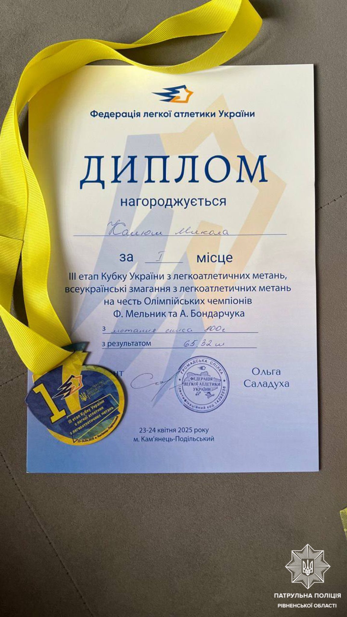 Поліцейський здобув перше місце у змаганнях із метання списа, його результат вражаючий – 65.32 м.