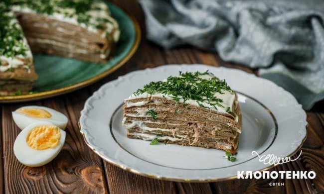 Охолоджені млинці з печінки змастіть шарами домашнього майонезу. Верхній «корж» теж перемажте та прикрасьте його подрібненими 10 гілочками кропу. Поставте до холодильника мінімум на 2 години, щоб просочився. Потім діставайте, нарізайте трикутними шматочками та подавайте до столу.